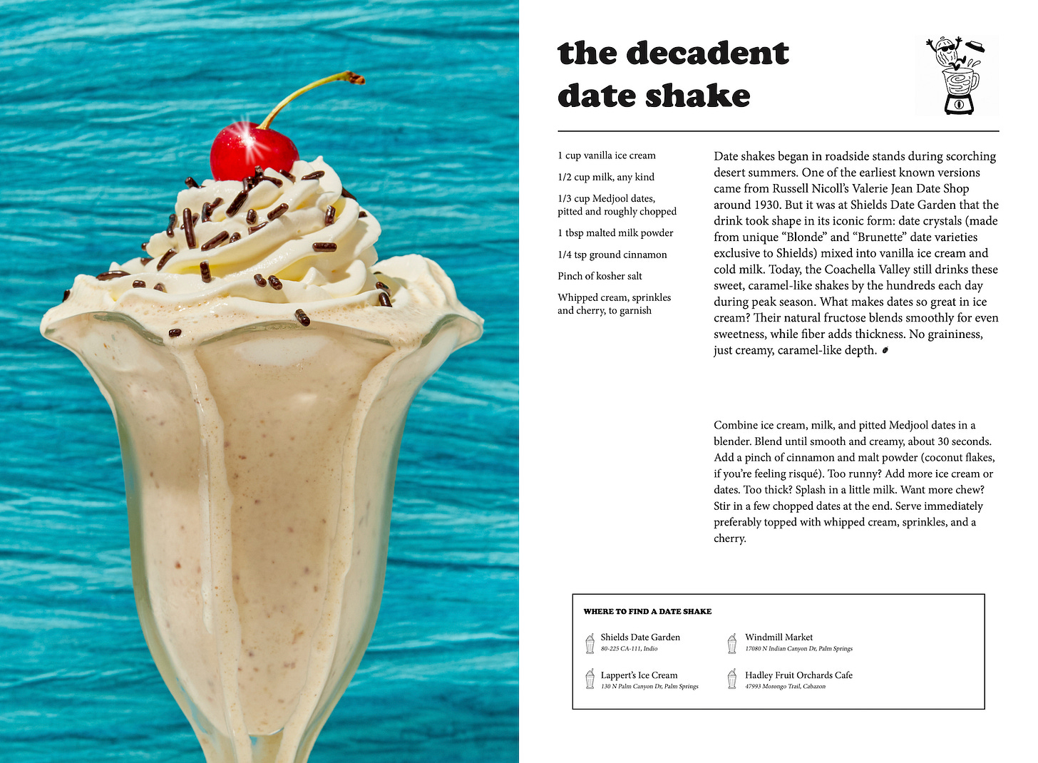 Seen through these lenses, the Coachella Valley becomes a place where the imagined and the lived collide: the date palm is at once a nostalgic treat, a new-age snack-bar ingredient, a religious tradition, a migrant-labor economy, a global export, and, for some, the perfect backdrop for an imagined desert oasis.