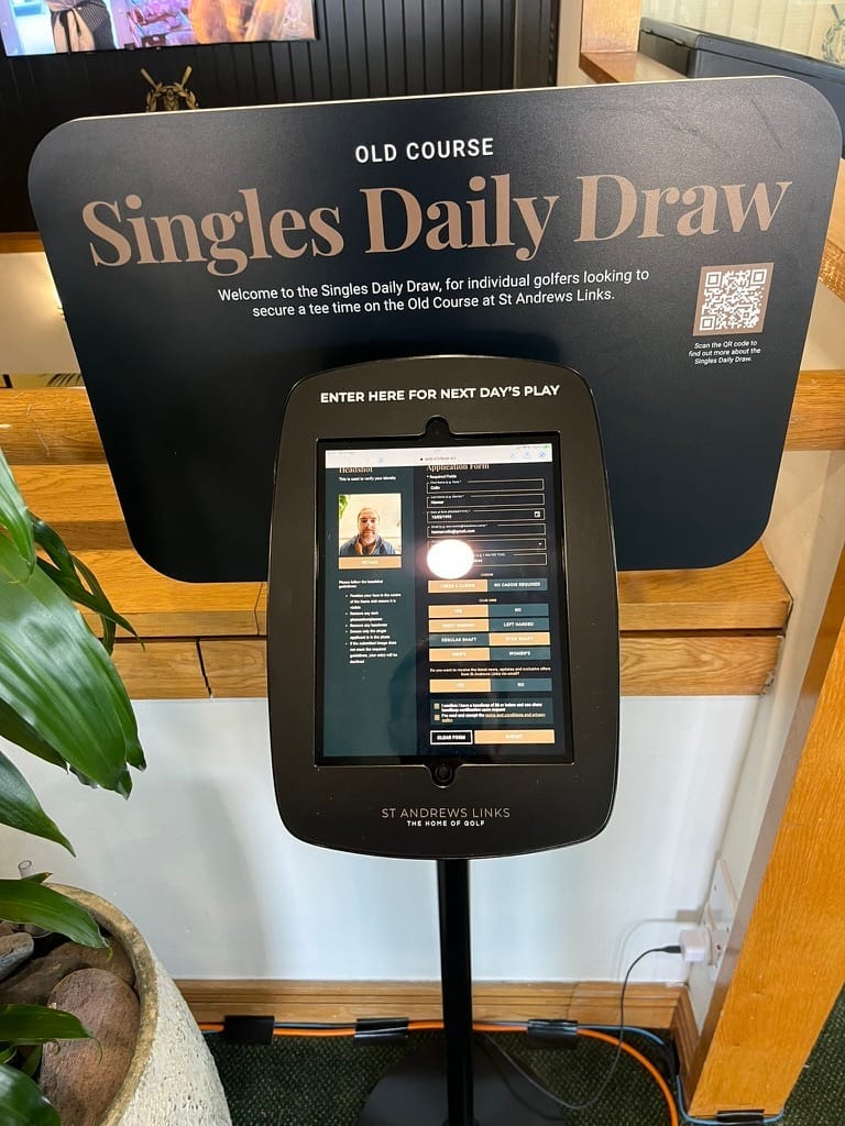 “Ah,” he said, unfolding his hands and gliding to his left to reveal—(!)—a metal stand holding an iPad. Like the kind you’d see at a doctor’s office. Or a bank kiosk. Or an airport lounge check-in. But now, inside the St. Andrews Links Clubhouse, just a few hundred steps from where guys with sticks whacked pebbles around the dunes half a millennium ago.
